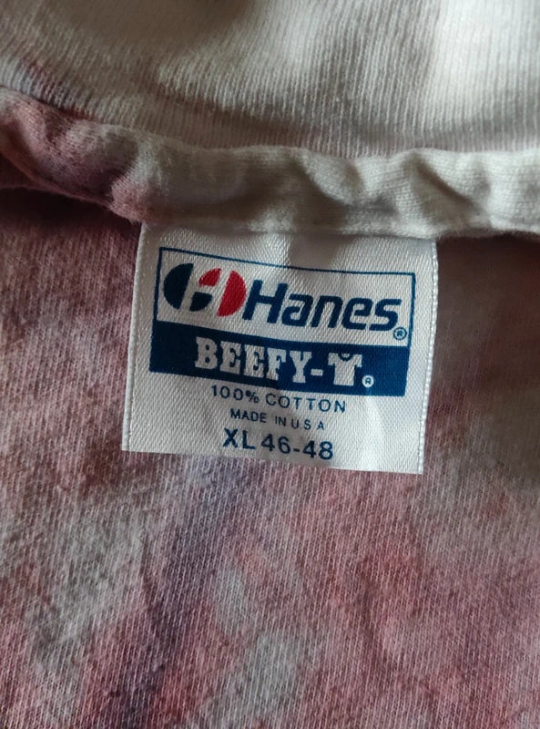 Remarques : L'intensité du Tie-Dye est bien conservée. L'épaisseur du coton est typique de l'étiquette Hanes Beefy-T de cette époque.