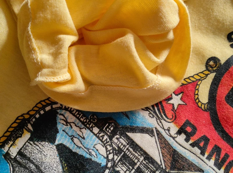 Remontez le temps jusqu'à l'ère de JR Ewing ! Ce T-shirt Jaune est une authentique relique du ranch Southfork, lieu de tournage mythique de la série culte Dallas, daté précisément de 1984-1985. Sa fabrication Single Stitch le confirme comme une pièce purement années 80.